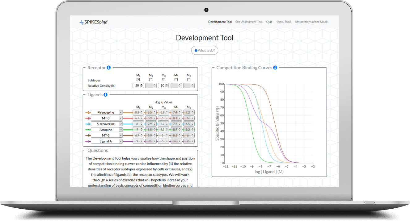 However, the Quiz Tool is different from the Self-Assessment tool as the ligands used in the Competition Binding studies are pre-selected by SPIKESbind . In the Quiz Tool, SPIKESbind selects 5 ligands – 4 of which will be randomly selected from the list of 7 selective Established ligands (Pirenzepine, Methoctramine, Darifenacin, MT-3, S-Secoverine, Solifenacin and DAU-5884 ), and one Hypothetical ligand, either Ligand A or Ligand B . This provides the opportunity for over 500 different questions to be posed by the Quiz Tool – sufficient to gain expert proficiency in interpreting competition binding data.